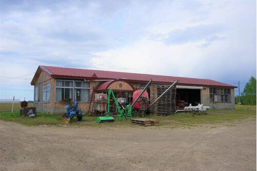 女満別町立朝日小学校を訪ねてみた。 校舎は残っていたけど農業用倉庫として転用されていた。 入口の上には校章も何とか残っている。 1967(昭和42)年に女満別小学校に統合されている。 いわゆる木造モルタル建てだ。 手前側がグラウンド。 左側が朝日公民…