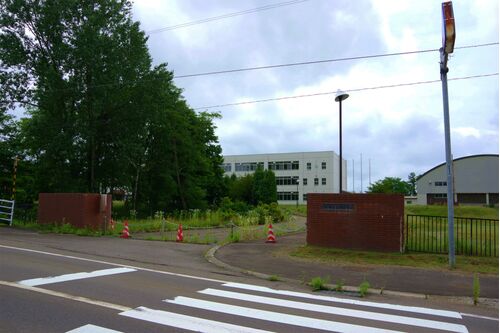 滝川市立江部乙中学校跡を訪ねてみた。 校門には滝川市立江部乙中学校のプレートが残っている。 校舎。 雑草が伸びていなければ まだ普通に使われていろうな雰囲気がある。 正面玄関。 校章。 シンボルツリーかな? 校舎と比較するとかなり大きい感じがする…
